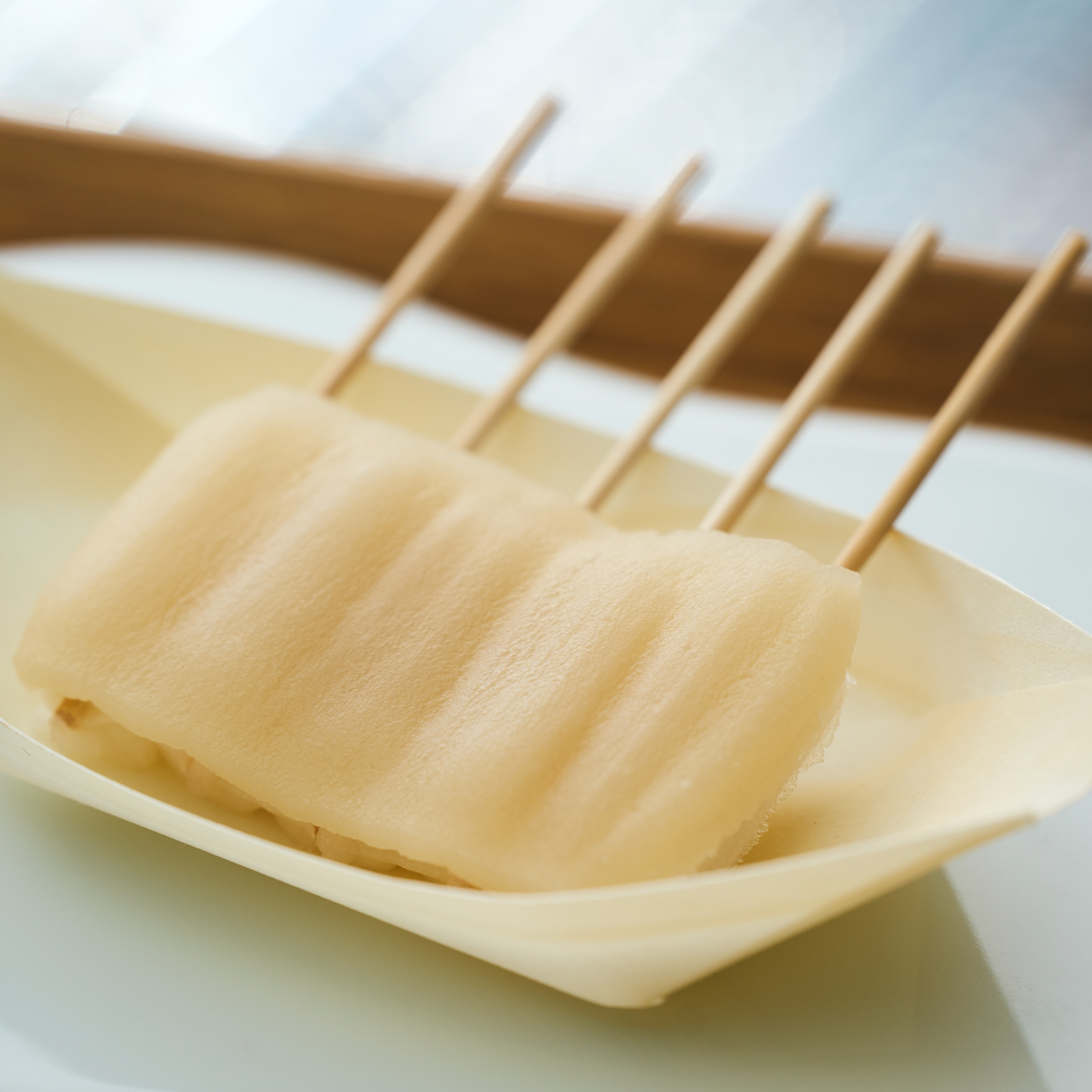 長いおみ坂を下ったら、いよいよ「HAREBARE STAND(ハレ晴れスタンド)」へ。スタッフに引換券を渡すと、天晴レ団子を一串おすそわけいたします。ゆったりとしたベンチシートでおくつろぎください。